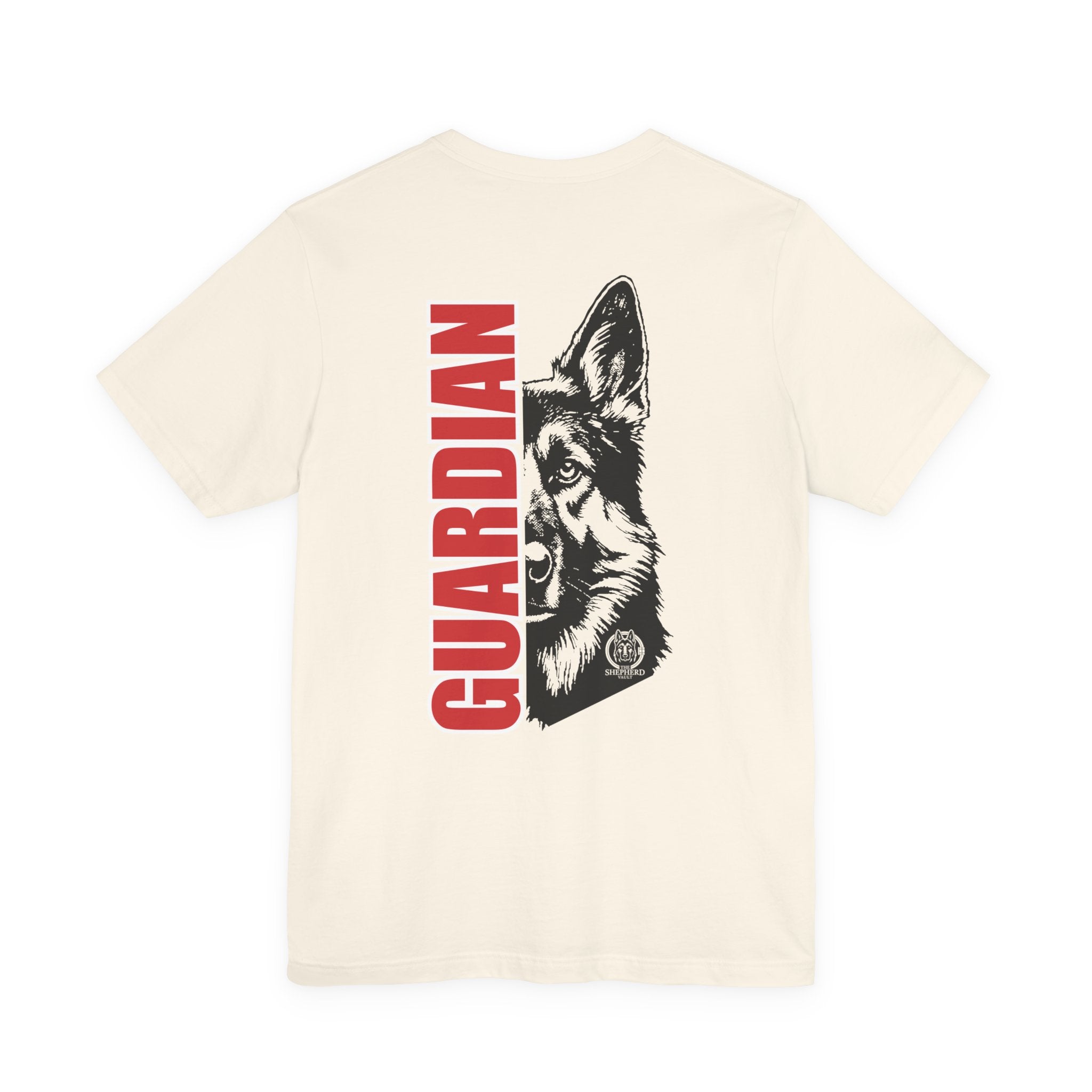 High-Fidelity Visuals: Features a striking split-design with the 'GUARDIAN' call sign in bold red, flanking the intense gaze of a GSD. It signals to the public: "I am protected by a high-drive asset."